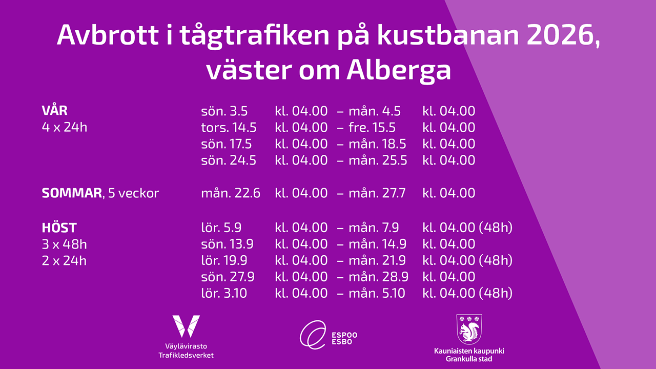 Trafikavbrotten sker under våren, sommaren och hösten och påverkar både närtågstrafiken i huvudstadsregionen och fjärrtågstrafiken mellan Helsingfors och Åbo. Efter midsommar pausas tågtrafiken väster om Alberga i fem veckor, precis som i 2024 och 2025. För att projektarbetet ska framskrida är det nödvändigt med avbrott i tågtrafiken.