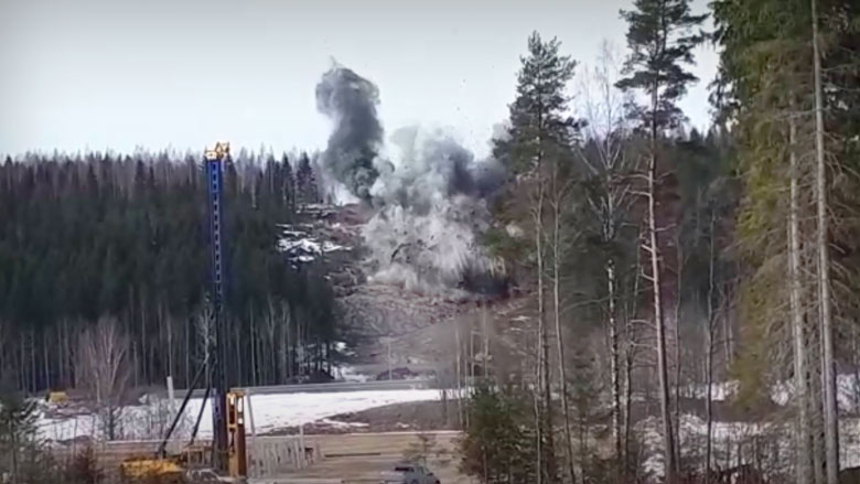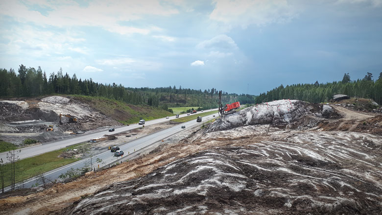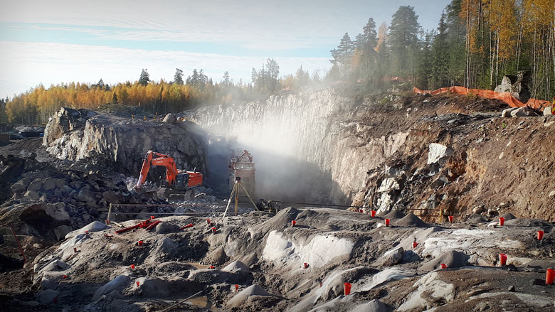 Foto: På fotot en brytningssprängning på byggplatsen för Rv 12 Lahtis södra ringväg mot Patiokallio från Hollola, där man gjort en 31 meter djup bergshuggning för den nya ringvägen. Fotot togs i april 2018.