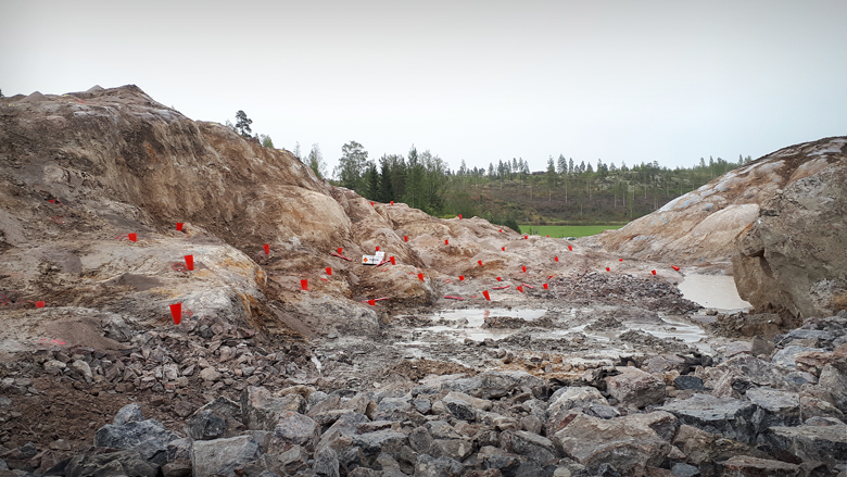 Foto: Ramputgrävningar för omfartsvägen i Klövskog vid riksväg 3 påbörjades hösten 2019. På fotot ett laddningsfält.