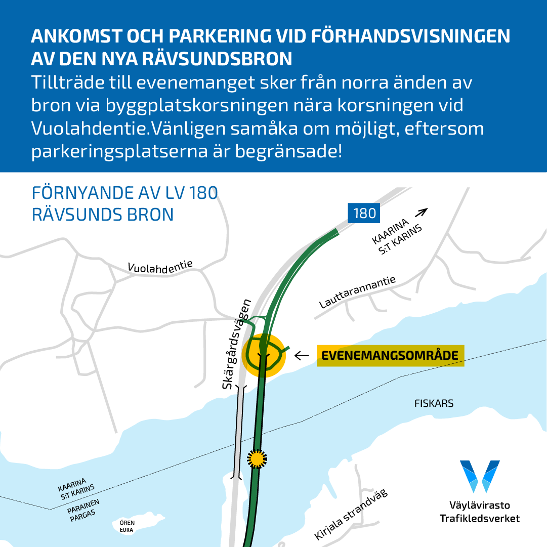 Publiken kan bekanta sig med den nya Rävsundsbron i förväg på onsdag 8e oktober kl 17-19. Ankomstinstruktionen finns nedan.