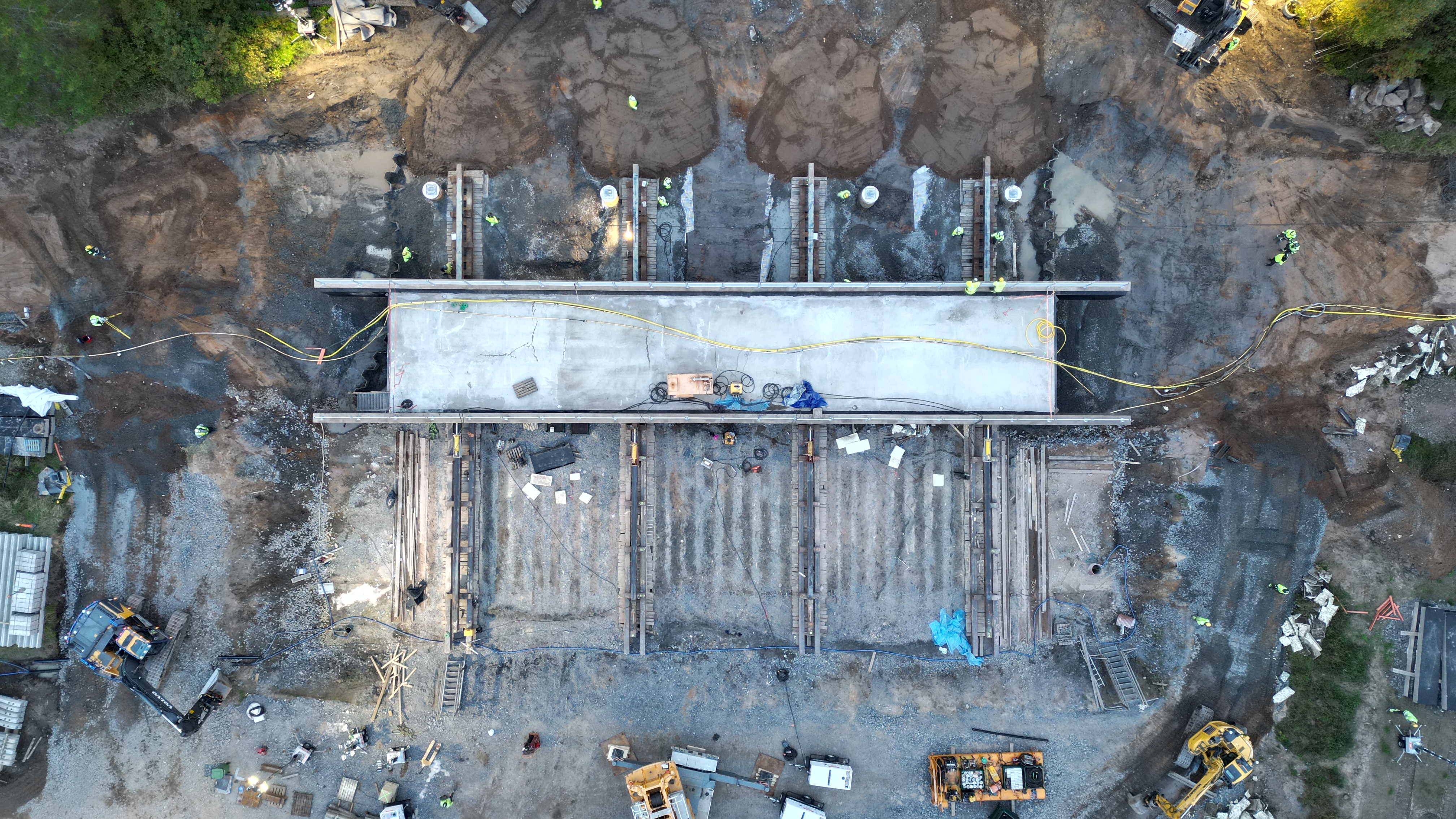 Havainnekuva sillansiirrosta: Haistilan 45 metriä pitkä ja noin 900 tonnia painava teräsbetonisilta tunkattiin paikoilleen 4.-6.10.2025.