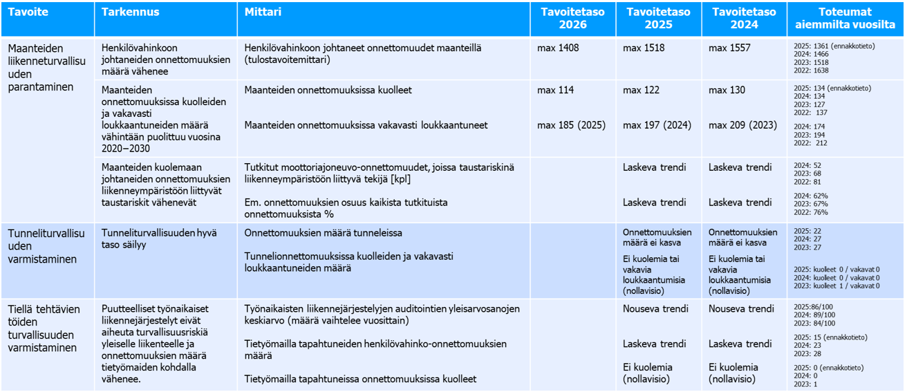 Väylävirastossa tieturvallisuudelle on asetettu kolme tavoitetta: maanteiden turvallisuuden parantaminen, tunneliturvallisuuden varmistaminen sekä tietyömaiden liikenneturvallisuuden varmistaminen. Kullakin tavoitealueella on 2–4 seurantamittaria. (Taulukko 2)