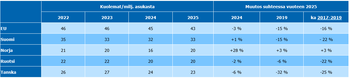 Kuten jo aiemmin on todettu, lyhyemmällä aikavälillä tavoitteena on vakavien loukkaantumisten ja kuolemien puolittaminen vuosina 2021–2030, käyttäen vuotta 2020 lähtötasona. Kehitys on toistaiseksi ollut maanteiden osalta pääosin tavoitteen mukainen (Kuva 3). Vuosina 2024 ja 2025 kuolleiden lukumäärä on ollut hieman tasaista laskua kuvaavan tavoitekehityksen yläpuolella. Läheisimpiin verrokkimaihin verrattuna liikennekuolemien määrä väkilukuun suhteutettuna on Suomessa korkeampi. Ero on kuitenkin kaventunut viime vuosien aikana, jolloin Suomi on noussut Euroopan keskikastista kärkipäähän. (Taulukko 3)