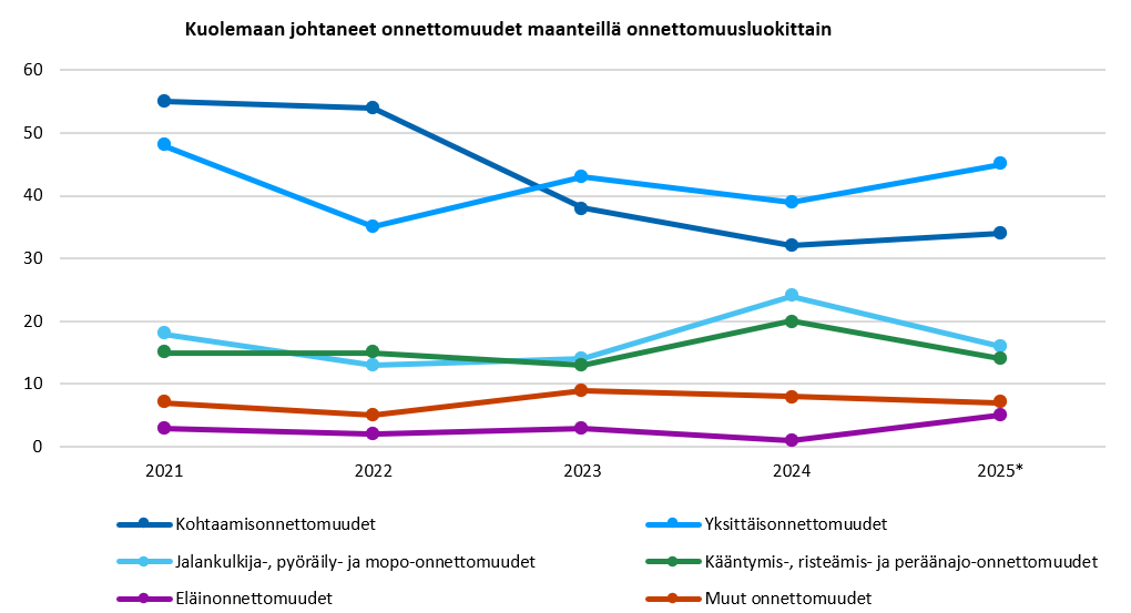Maantieverkon kuolemaan johtaneista onnettomuuksista noin 60 % on viime vuosina ollut yksittäisonnettomuuksia ja kohtaamisonnettomuuksia, eikä vuonna 2025 osuudessa tapahtunut suuria muutoksia. Näiden luokkien onnettomuusmäärät kasvoivat hieman edellisvuoteen verrattuna. Kääntymis-, risteämis- ja peräänajo-onnettomuuksien sekä jalankulkija-, polkupyörä- ja mopo-onnettomuuksien määrät sen sijaan laskivat hieman. Näissä luokissa onnettomuusmäärät ovat kuitenkin pieniä ja vuotuinen satunnaisvaihtelu voi sitten olla suhteellisesti suurta. (Kuva 2)