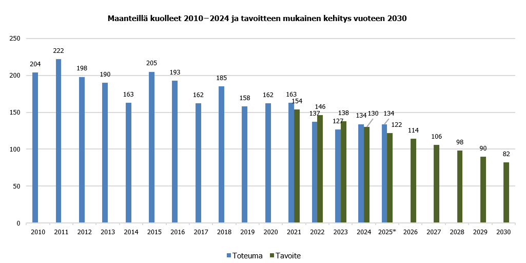 Maanteillä kuolleiden määrällä mitattuna turvallisuuskehitys on ollut viime vuosina myönteinen, kun kuolemien määrän kehitys on ollut laskeva. Kahden viime vuoden aikana hyvä kehitys on kuitenkin pysähtynyt. Vuoden 2025 ennakkotietojen perusteella maanteillä kuolleiden määrä tulee ylittämään edellisvuonna kuolleiden määrän, koska tiedot täydentyvät vielä vuoden edetessä. Myös koko Suomen tieverkolla ollaan noin edellisvuoden tasolla. Liikenneturvallisuustavoitteen mukaisesta kehityksestä on jääty jälkeen.
