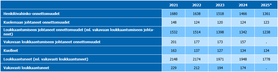 Taulukko 1. Maanteiden onnettomuustilastot vuosina 2021–2025 (*ennakkotieto 30.3.2026, tiedot täydentyvät vuoden edetessä). Lähde: Tilastokeskus