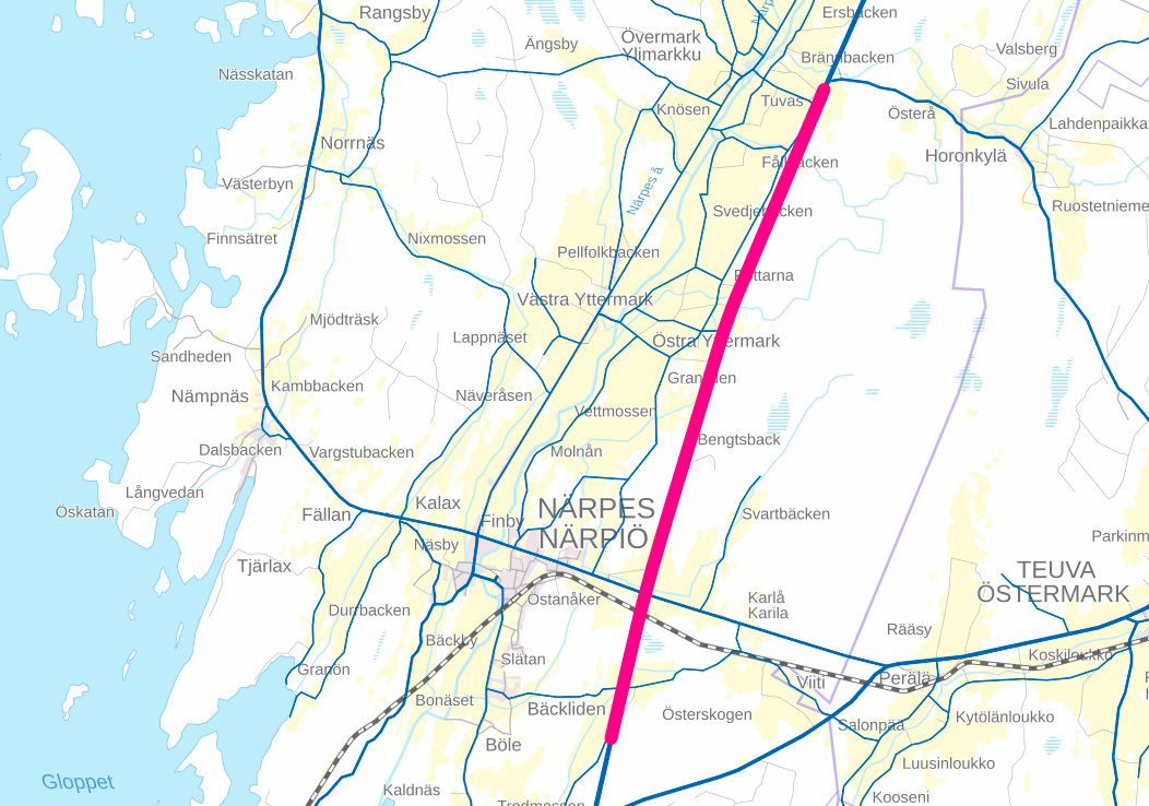 Suunnittelualue sijaitsee valtatiellä 8 Närpiön kaupungin alueella välillä Bäckliden - Brännbacken. Suunnittelukohde alkaa noin 200 metriä maantien 17093 (Bäcklidvägen) liittymän eteläpuolelta ja päättyy noin 20 kilometriä pohjoisempana noin 150 metriä Brännbackintien liittymän eteläpuolelle. Suunnittelukohteen sijainti on esitetty alla olevalla kartalla punaisella viivalla.