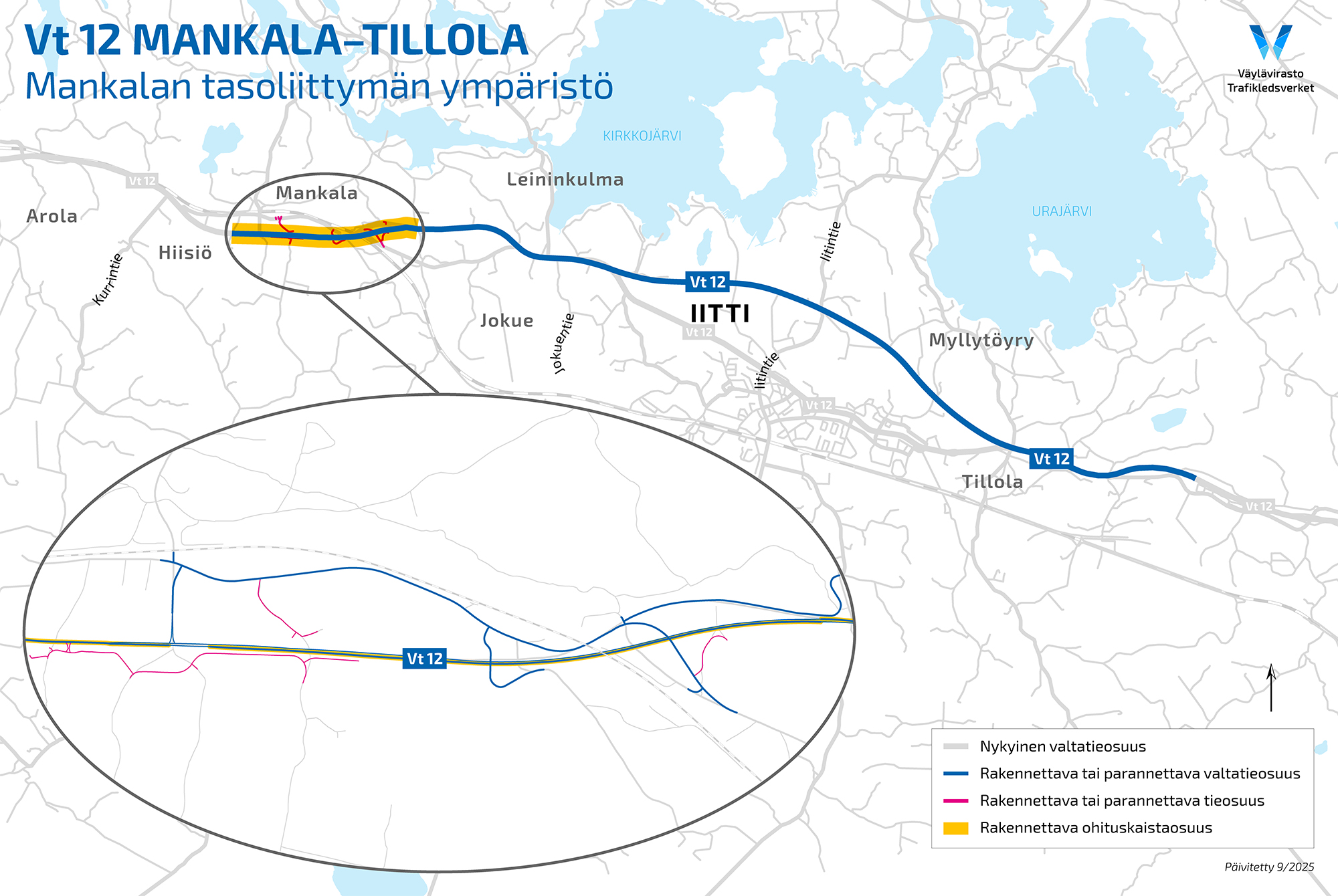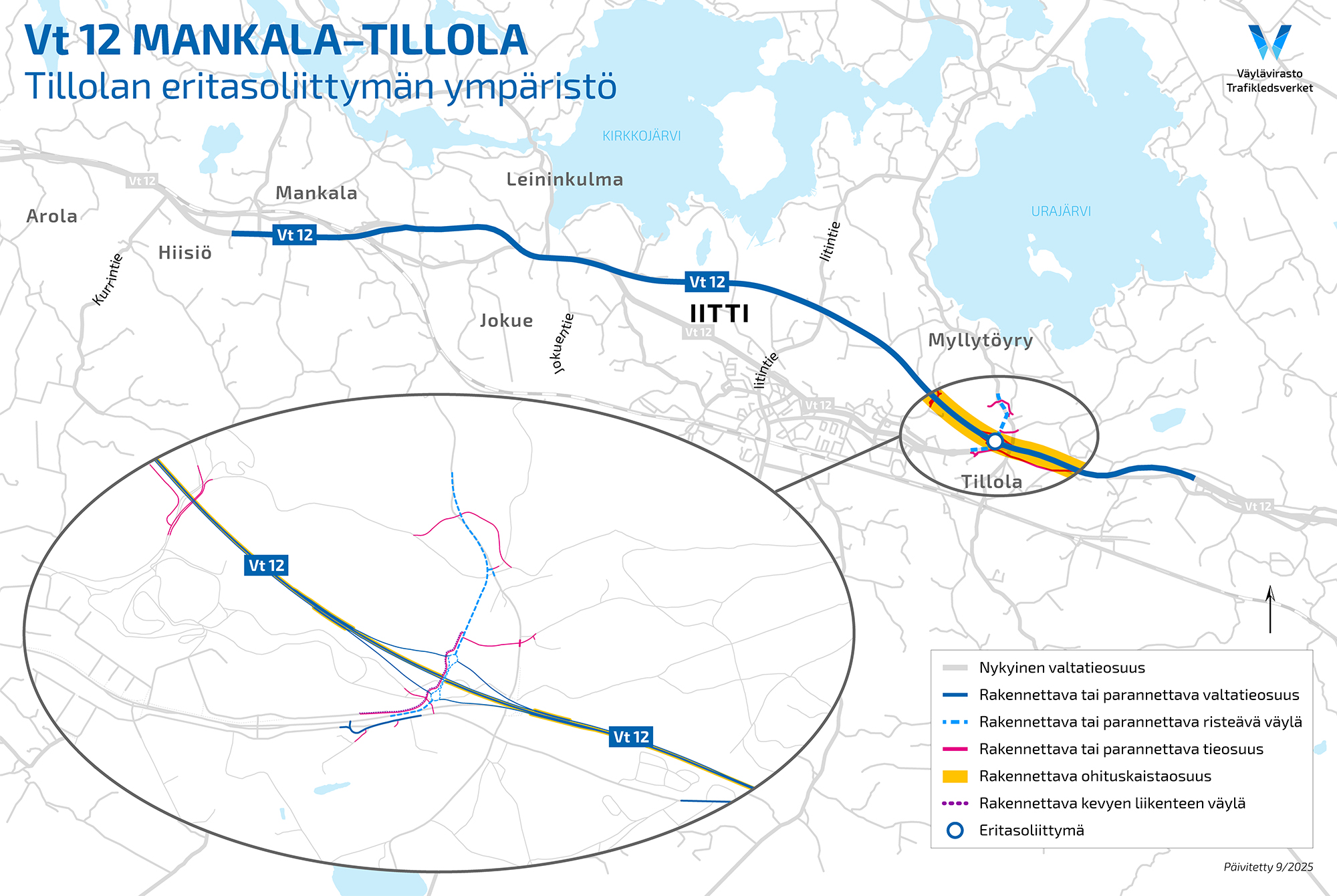 Vt 12 Mankala–Tillola -hankkeessa parannetaan valtatietä 12 yhdellä Lahti–Kouvola-välin ongelmallisimmista osuuksista eli Mankalan ja Tillolan välillä. Pääset tutustumaan hankkeen yleis- ja suunnitelmakarttoihin sekä esittelymateriaaleihin tuotettuihin yksinkertaistettuihin karttoihin alla olevien linkkien kautta.