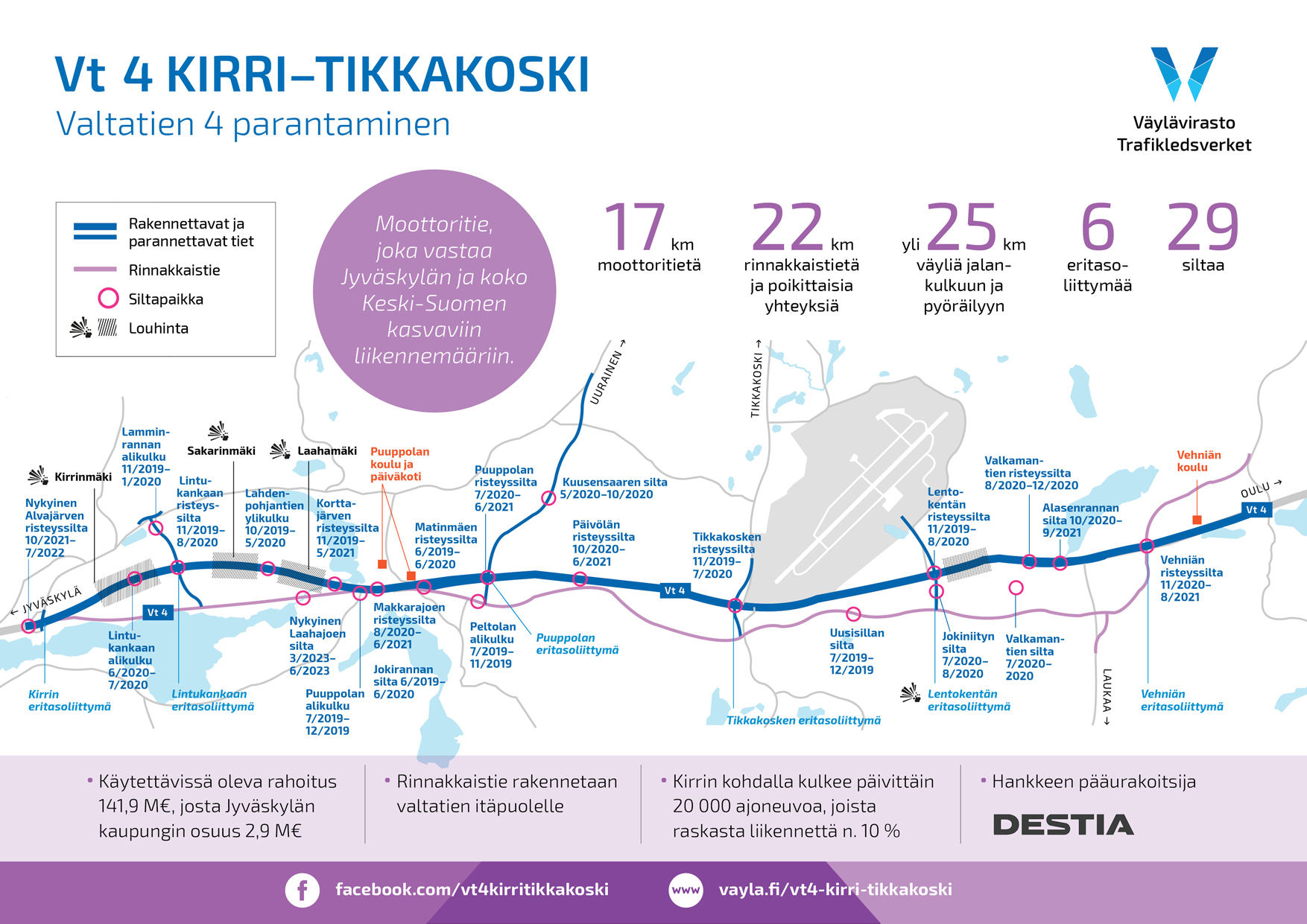 Tiehanke on saanut rahoituksen Suomen valtion budjetissa 2018. Tiesuunnitelmien kustannusarvioiden perusteella hankekokonaisuudella on käytettävissä 141,9 miljoonaa euroa, josta Jyväskylän kaupungin osuus on 2,9 miljoonaa euroa.