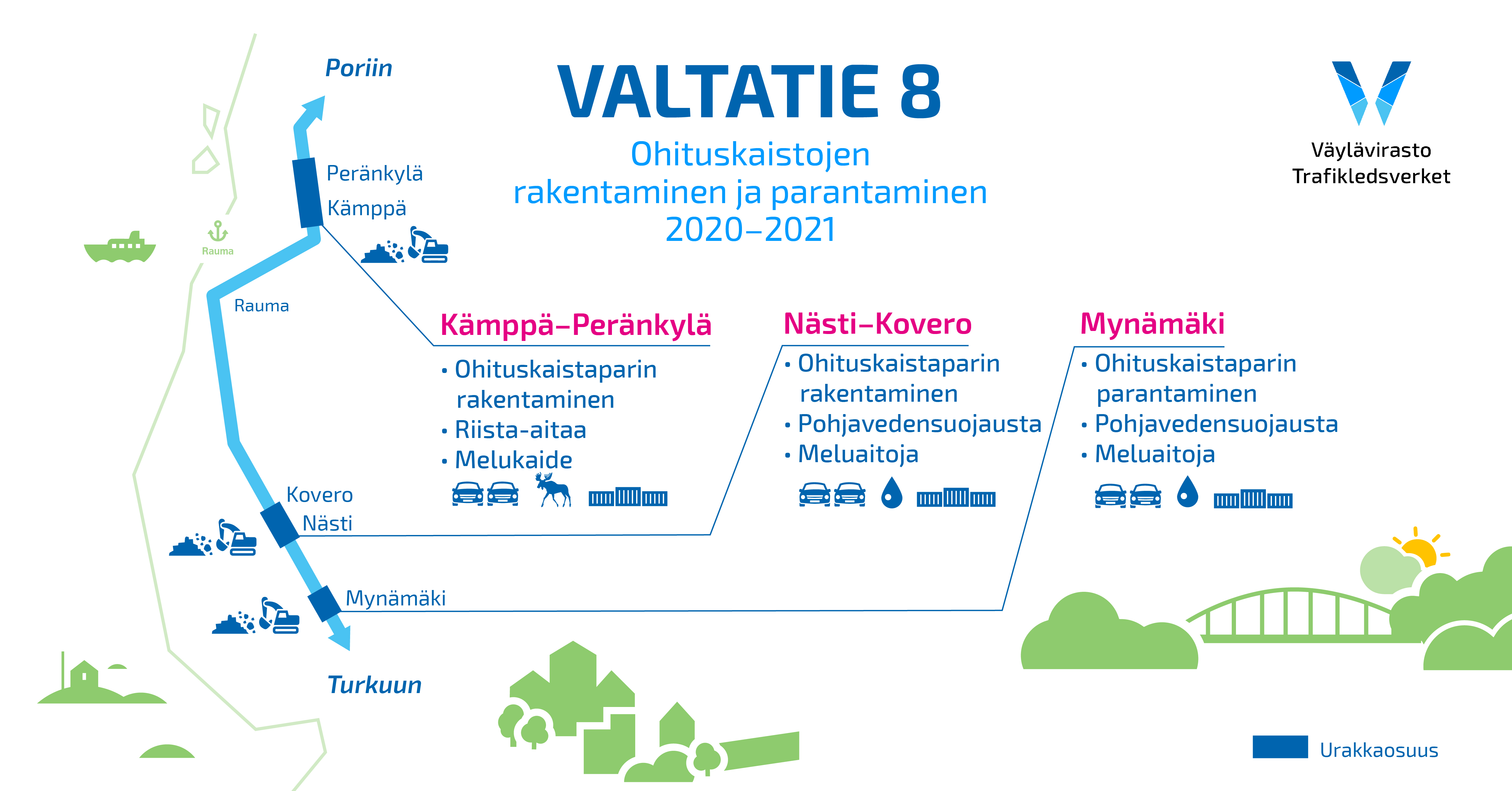 Vuosina 2020 ja 2021 valtatie 8:lle rakennetaan kolme ohituskaistaparia Turun ja Porin välille. Hanke pitää sisällään sekä Mynämäen vanhan ohituskaistaparin parantamisen että kahden kokonaan uuden kaistaparin rakentamisen Laitilaan ja Eurajoelle. Hankkeen tavoitteena on lisätä liikenteen sujuvuutta, tasaisia matka-aikoja sekä tiellä liikkuvien ihmisten turvallisuutta.